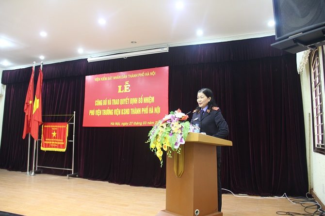 Tại buổi lễ, đồng chí Nguyễn Văn Minh- Phó Vụ trưởng Vụ Tổ chức cán bộ Viện KSND tối cao đã công bố Quyết định bổ nhiệm đồng chí Bùi Thị Hồng Anh - Viện trưởng Viện KSND quận Hà Đông giữ chức vụ Phó Viện trưởng Viện KSND thành phố Hà Nội, nhiệm kỳ 5 năm, kể từ ngày 01/4/2015.