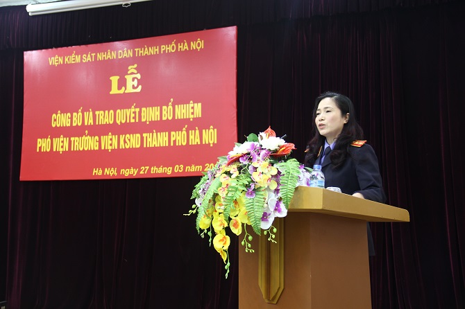 Phát biểu tại buổi lễ, đồng chí Nguyễn Thị Thủy Khiêm - Phó Viện trưởng Viện KSND tối cao chúc mừng đồng chí Bùi Thị Hồng Anh đã được bổ nhiệm giữ chức vụ mới. Đồng chí khẳng định việc bổ nhiệm đồng chí Bùi Thị Hồng Anh ngày hôm nay là kết quả phấn đấu nỗ lực của đồng chí Hồng Anh trong nhiều năm qua cùng với sự tín nhiệm, đánh giá cao của tập thể Ban cán sự Đảng Viện KSND tối cao, Ban cán sự Đảng Viện KSND thành phố Hà Nội cũng như sự tín nhiệm của cán bộ ngành Kiểm sát Thủ đô dành cho đồng chí Bùi Thị Hồng Anh. Đồng thời, đồng chí Nguyễn Thị Thủy Khiêm cũng đề nghị đồng chí Hồng Anh trên cương vị mới tiếp tục phát huy năng lực, sở trường của mình cùng với tập thể Lãnh đạo Viện KSND thành phố Hà Nội đoàn kết, xây dựng đơn vị ngày càng lớn mạnh.