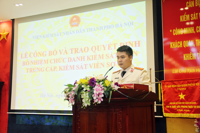 Thay mặt các đồng chí được bổ nhiệm Kiểm sát viên trung cấp và Kiểm sát sát viên sơ cấp đồng chí Ngô Ngọc Quảng, Kiểm sát viên sơ cấp Viện KSND quận Cầu Giấy đã phát biểu cảm ơn sự quan tâm, tạo điều kiện của Ban Cán sự Đảng, tập thể Lãnh đạo Viện KSND thành phố Hà Nội, lãnh đạo đơn vị và hứa sẽ tiếp tục phấn đấu hoàn thành tốt nhiệm vụ được giao trên cương vị công tác là kiểm sát viên để đóng góp thành tích của cá nhân vào thành tích chung của cơ quan, đơn vị.