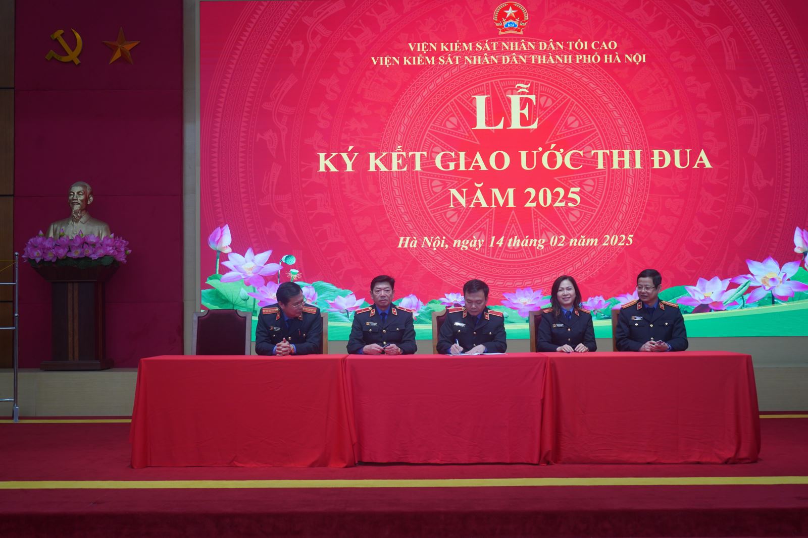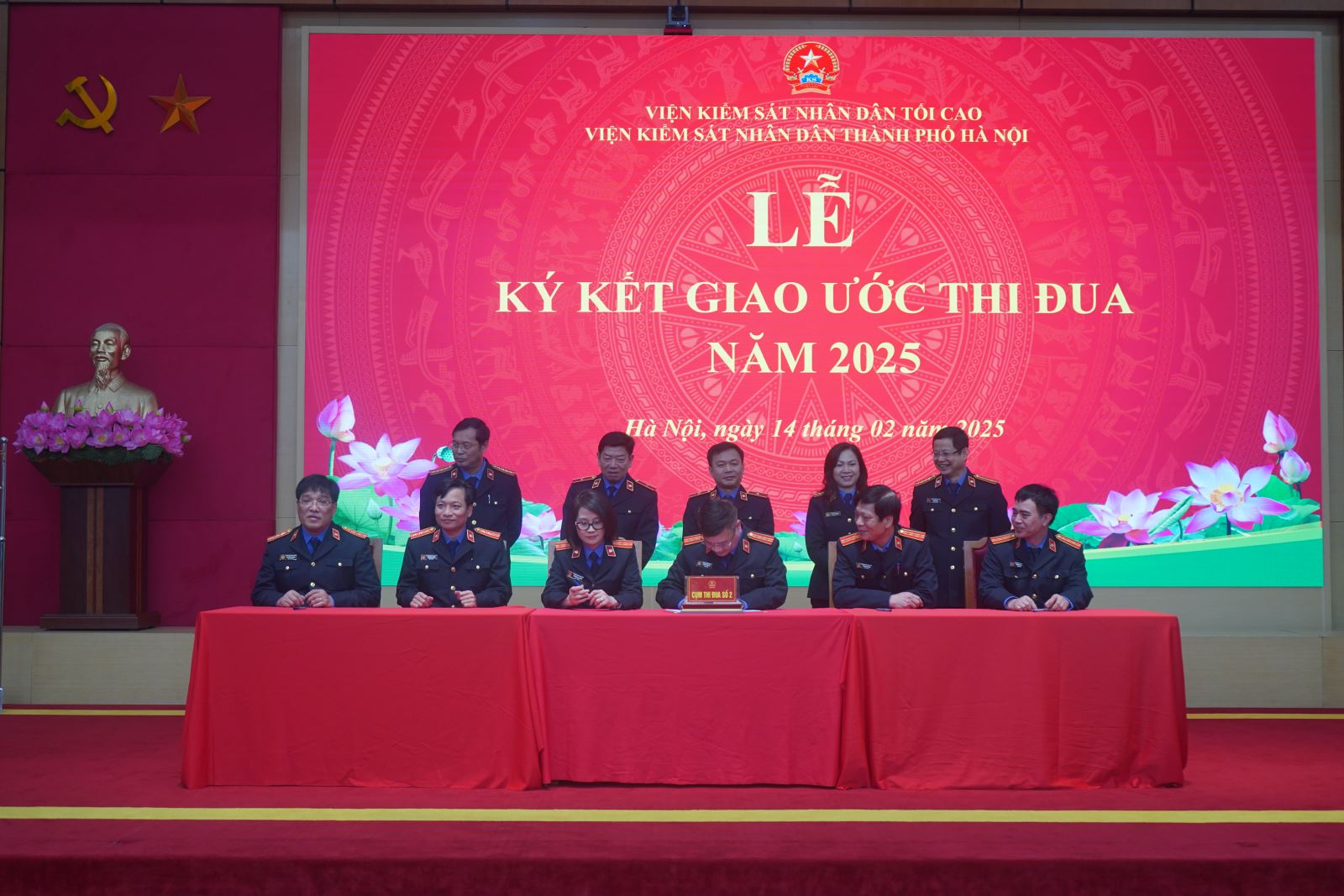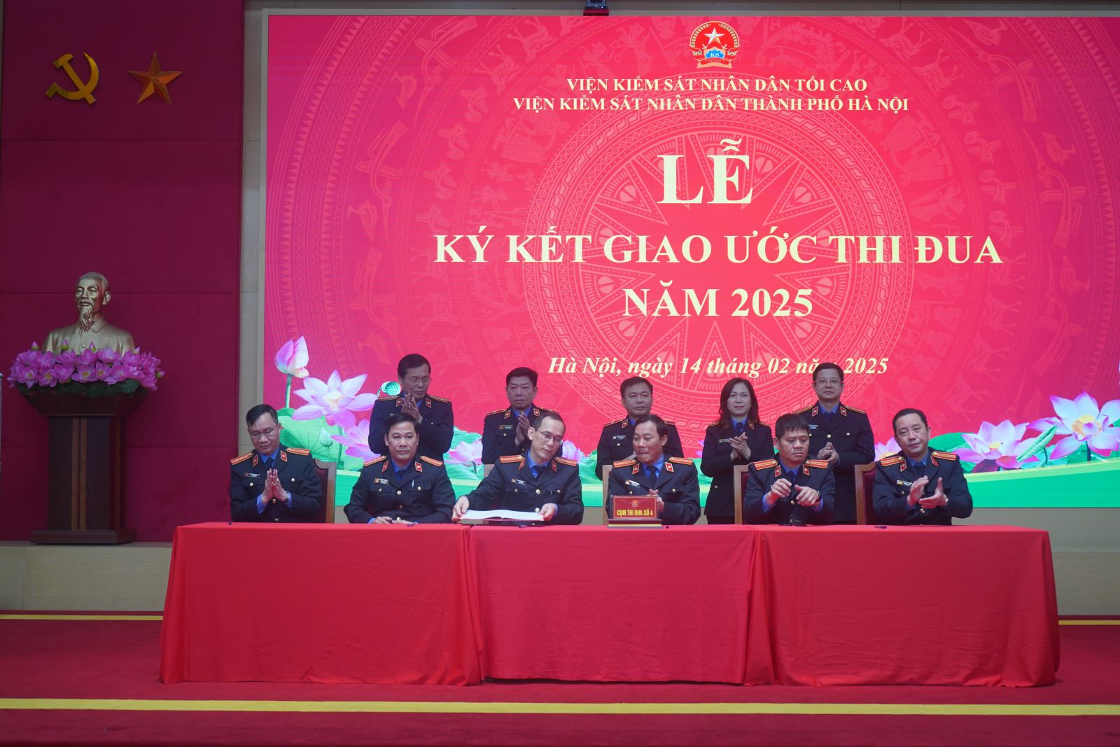 Các đồng chí Lãnh đạo Viện KSND thành phố Hà Nội cùng ký chứng kiến Bản giao ước thi đua năm 2025