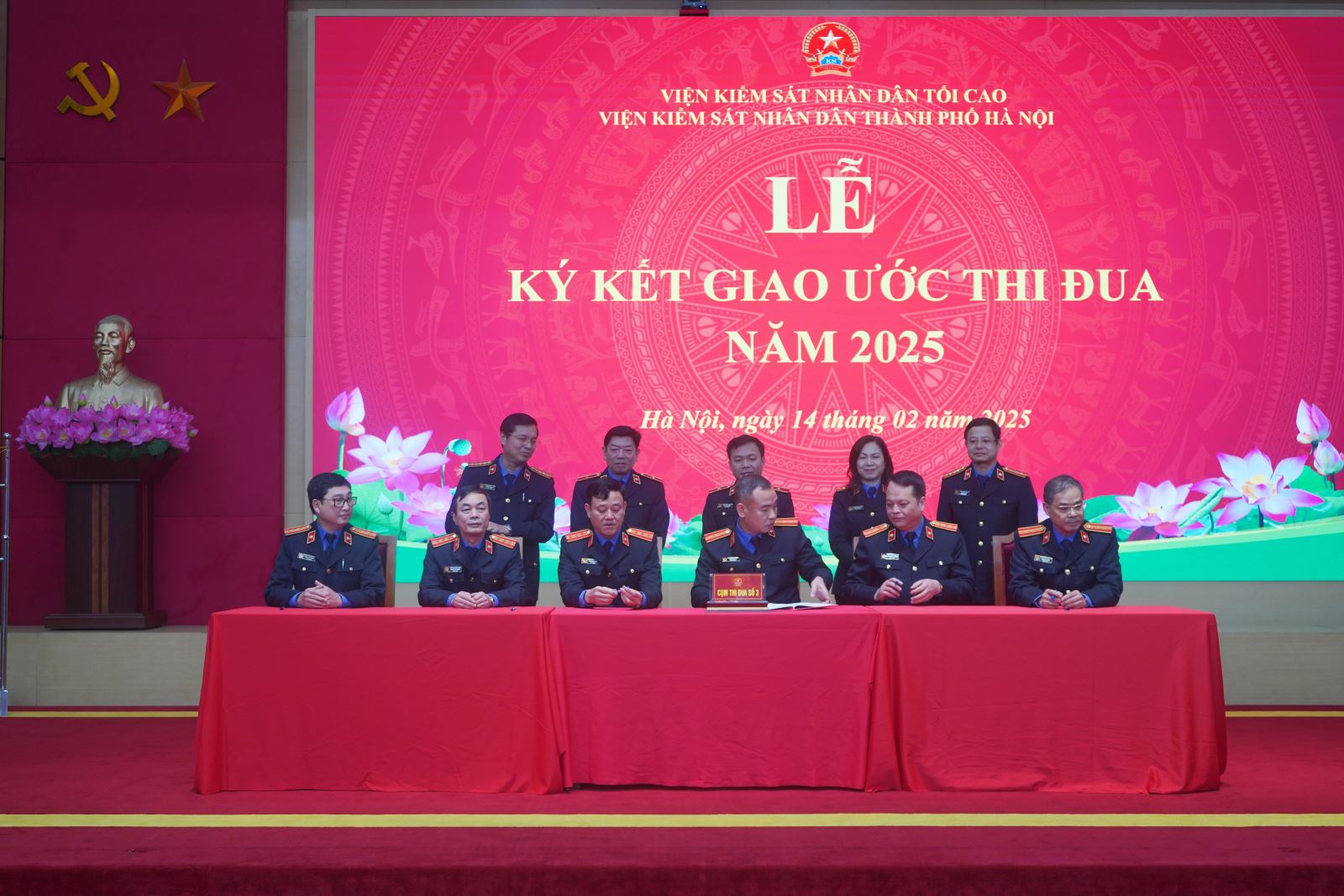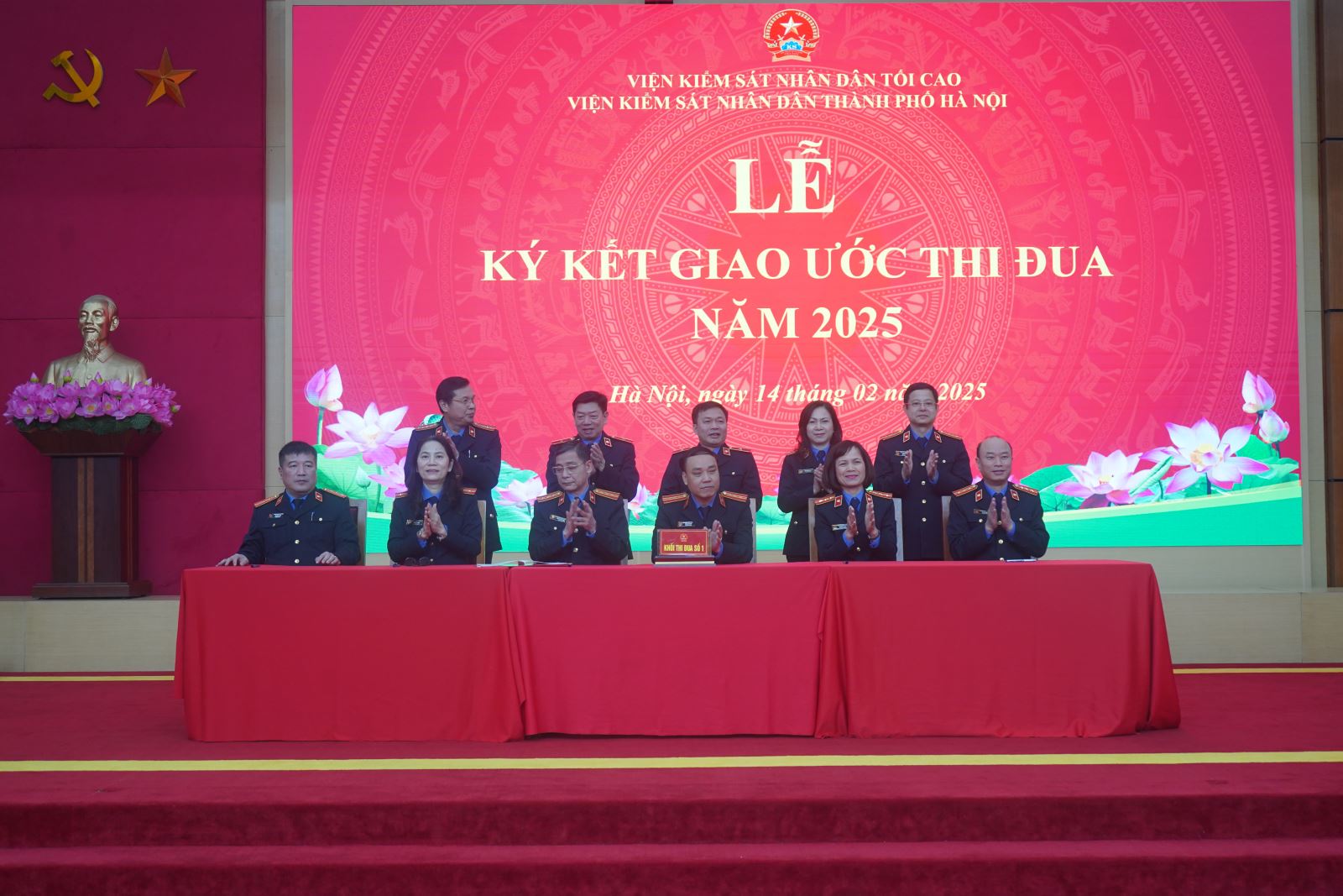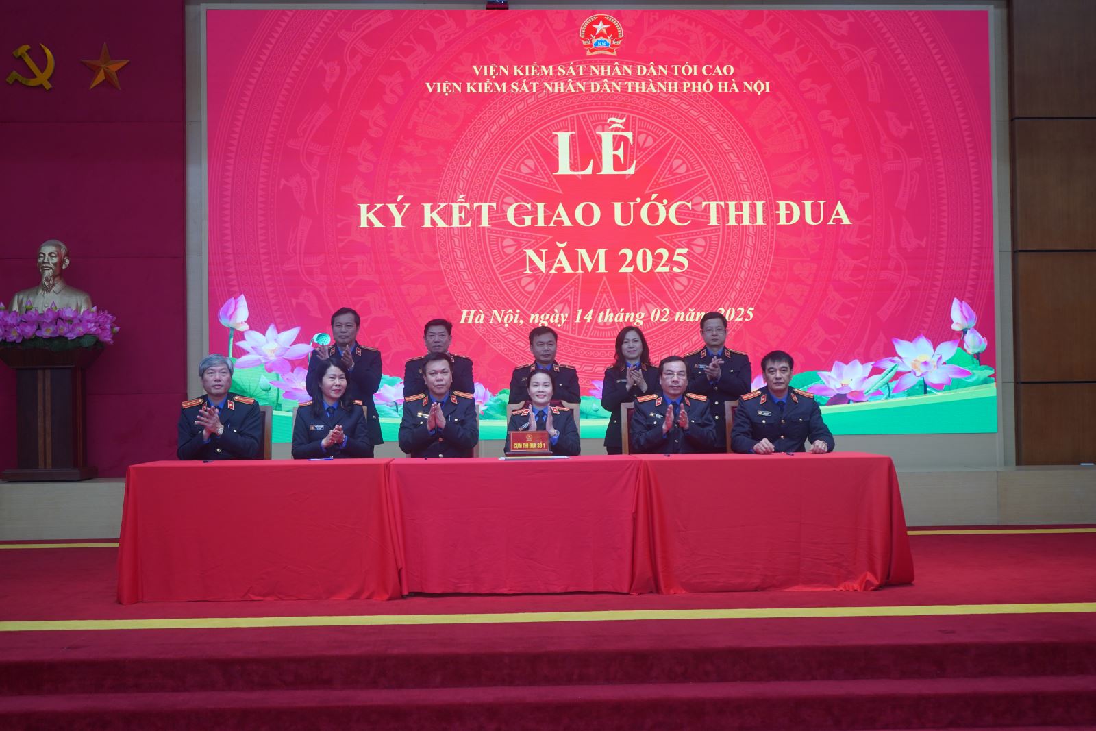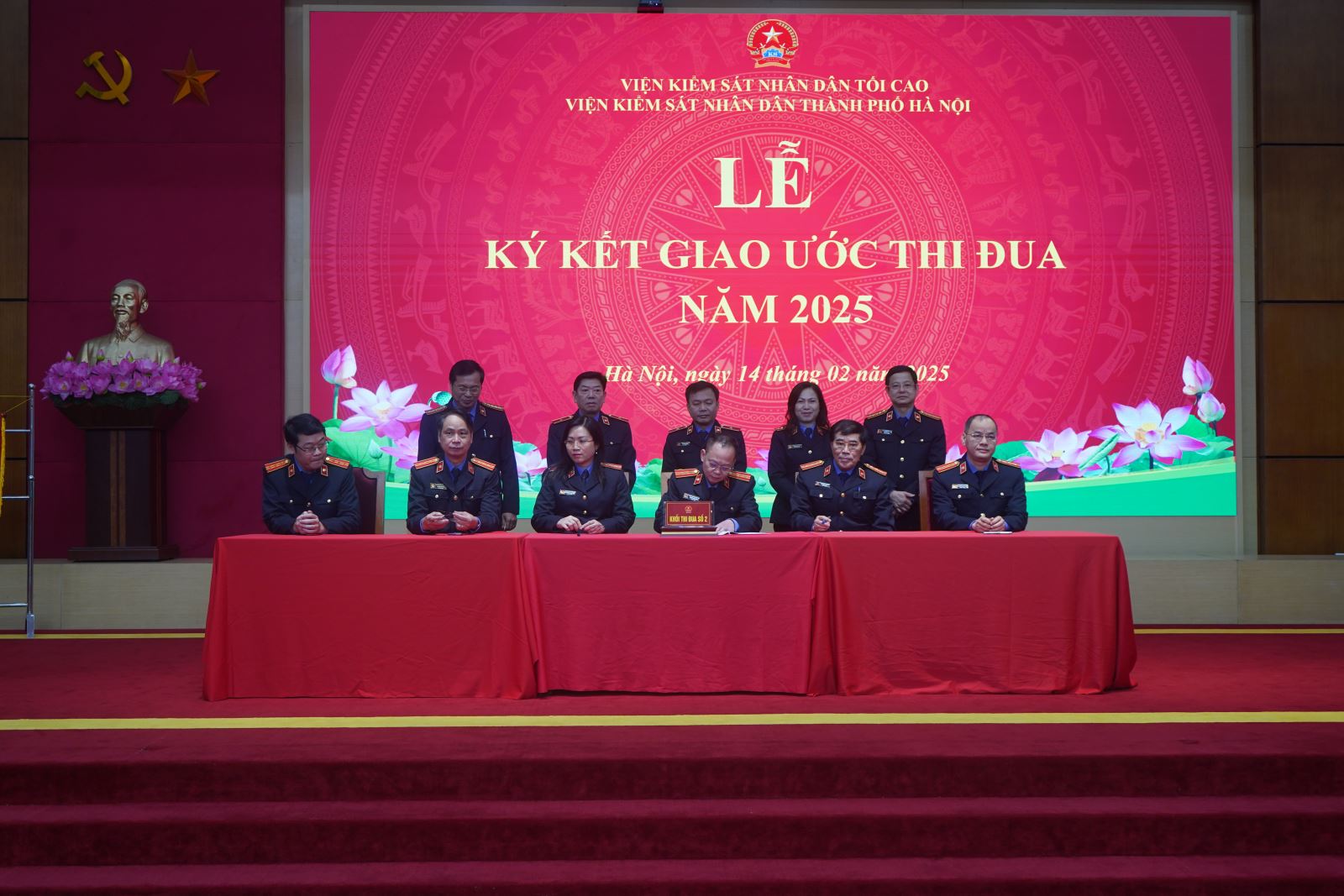 Các đồng chí Lãnh đạo Viện KSND thành phố Hà Nội cùng ký chứng kiến Bản giao ước thi đua năm 2025