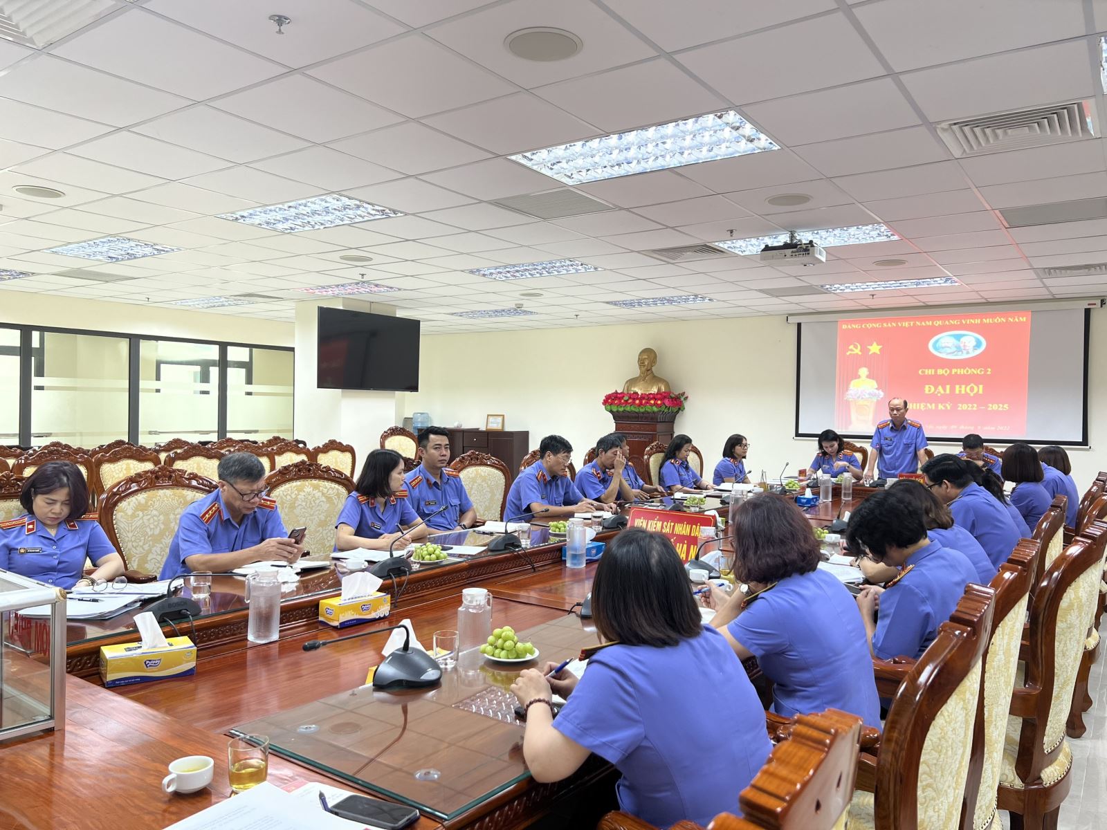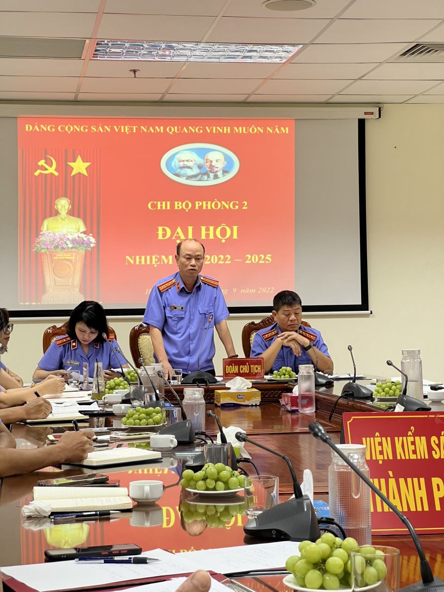 Thực hiện Kế hoạch số 35-KH/ĐU ngày 19/5/2022 của Đảng ủy Viện KSND thành phố Hà Nội về việc tổ chức Đại hội Chi bộ trực thuộc Đảng ủy cơ sở nhiệm kỳ 2022 - 2025. Ngày 09/9/2022, Chi bộ Phòng 2 - Viện KSND thành phố Hà Nội tiến hành Đại hội nhiệm kỳ 2022 - 2025 để đánh giá kết quả lãnh đạo của Chi bộ nhiệm kỳ 2020 - 2022 và đề ra phương hướng, nhiệm vụ lãnh đạo của Chi bộ nhiệm kỳ 2022 - 2025 nhằm thực hiện tốt Nghị quyết của Đảng ủy Viện KSND thành phố Hà Nội.