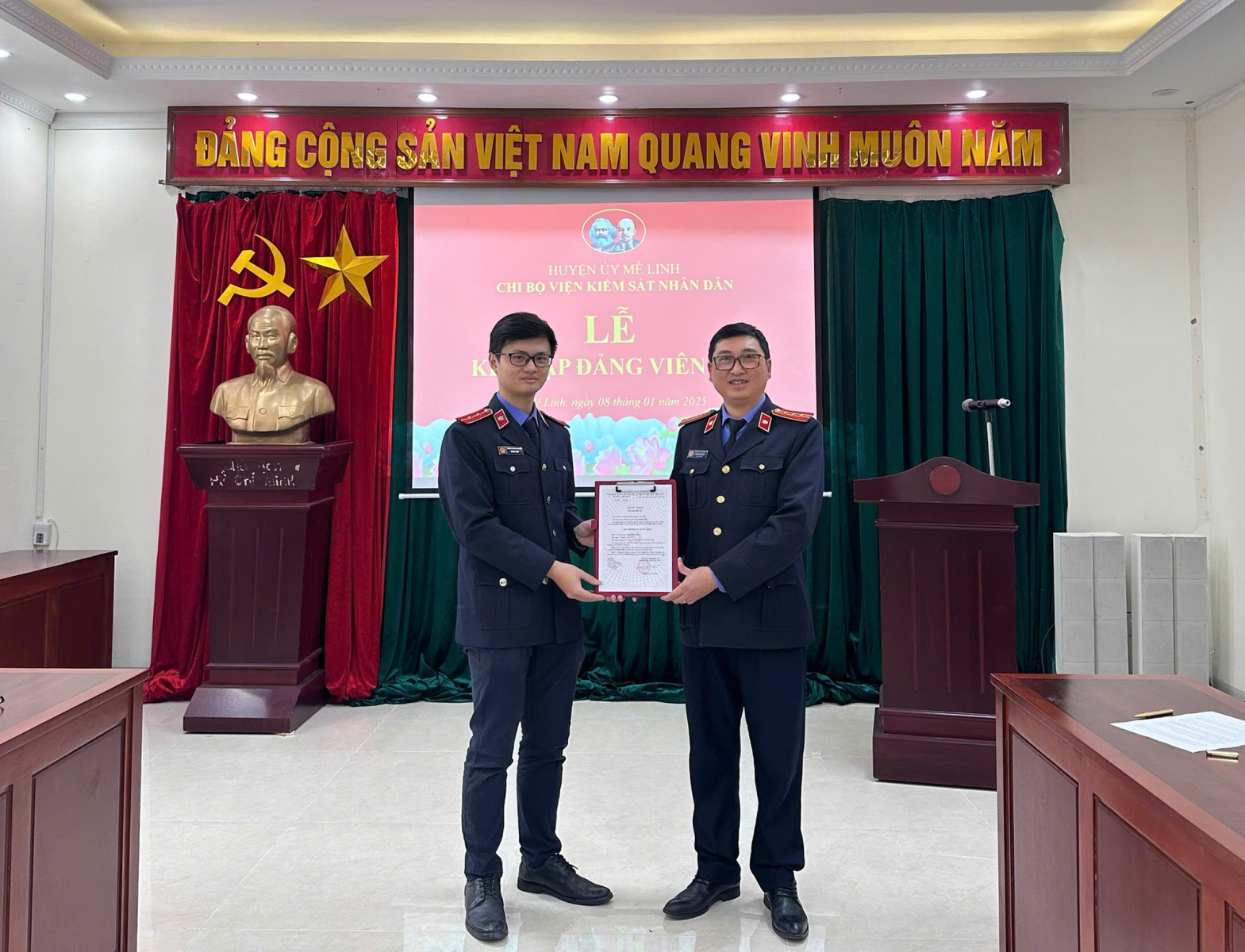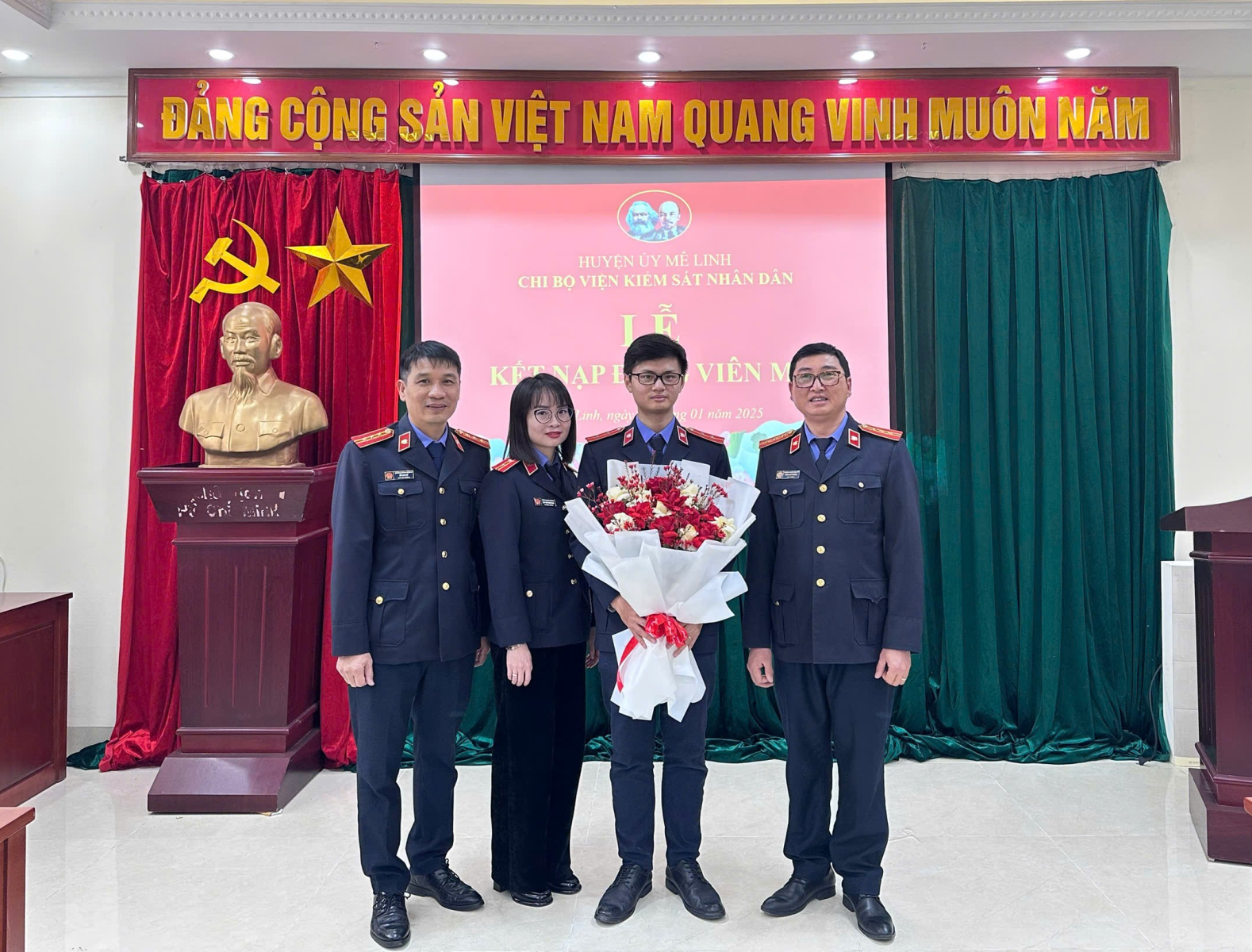 Sáng ngày 08/01/2025, được sự nhất trí của Ban Thường vụ Huyện uỷ Mê Linh, Chi bộ Viện KSND huyện Mê Linh đã long trọng tổ chức Lễ Kết nạp Đảng viên đối với quần chúng ưu tú Hoàng Hiệp – Chuyên viên Viện KSND huyện Mê Linh. Tham dự buổi Lễ có đồng chí Trần Chí Thành – Huyện uỷ viên, Bí thư Chi bộ, Viện trưởng Viện KSND huyện Mê Linh cùng tất cả các đồng chí Đảng viên trong Chi bộ.
