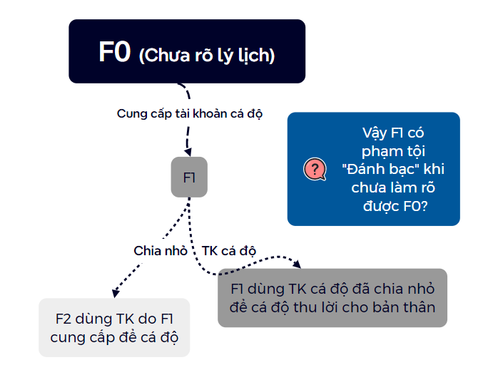 Trong quá trình điều tra, truy tố, xét xử các vụ án đánh bạc bằng hình thức này, có nhiều vụ không làm rõ được các đối tượng cửa trên (F0) đã cung cấp tài khoản cá độ cho đối tượng bị bắt giữ. Điển hình là vụ: