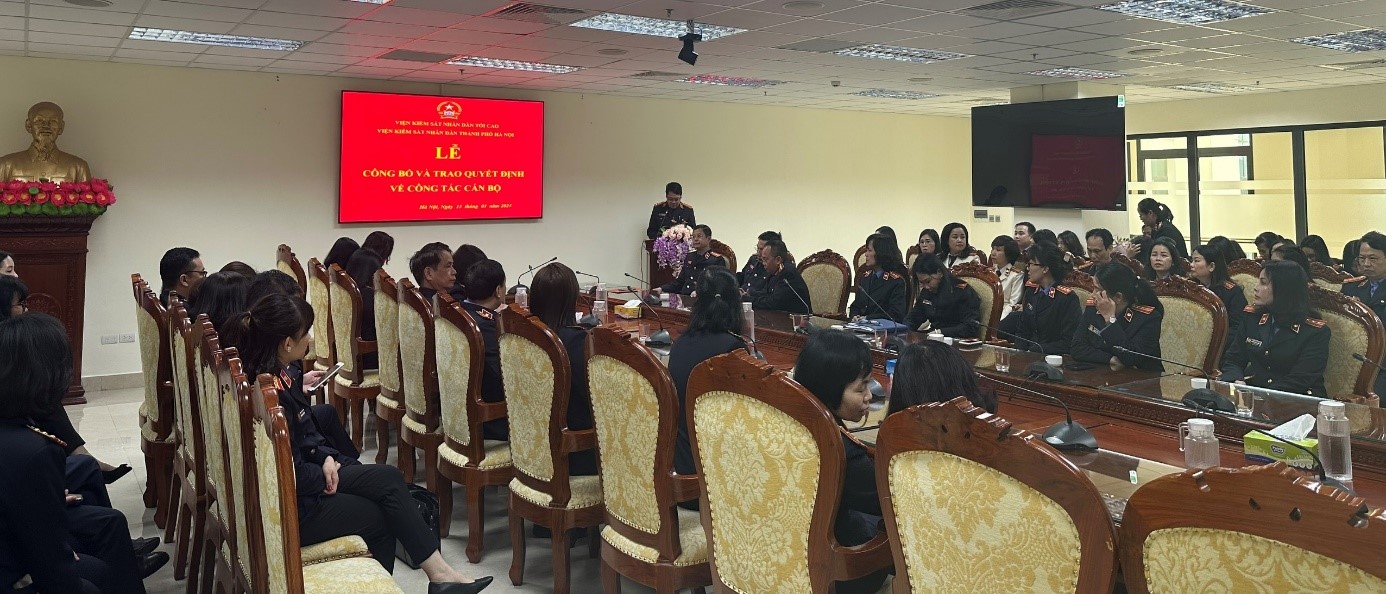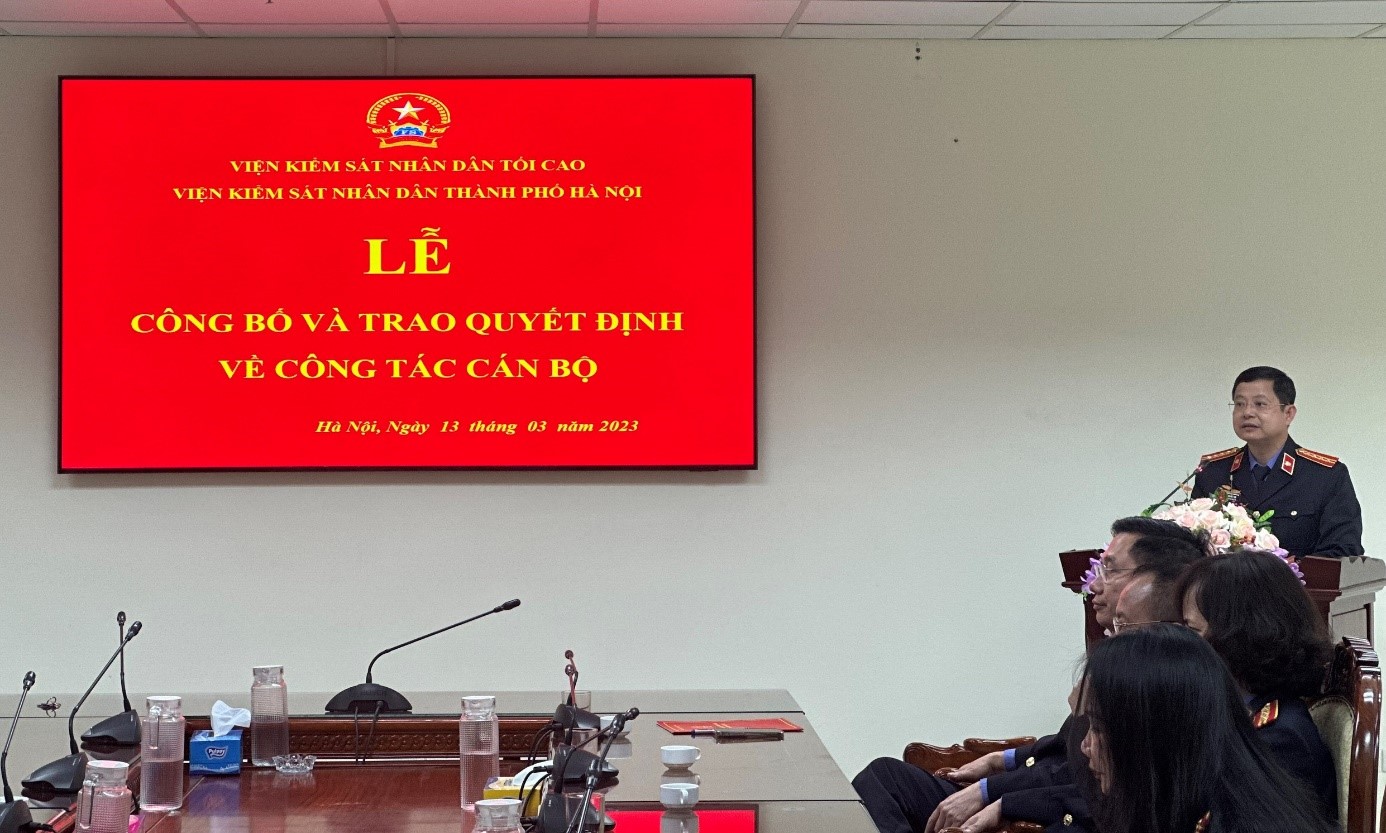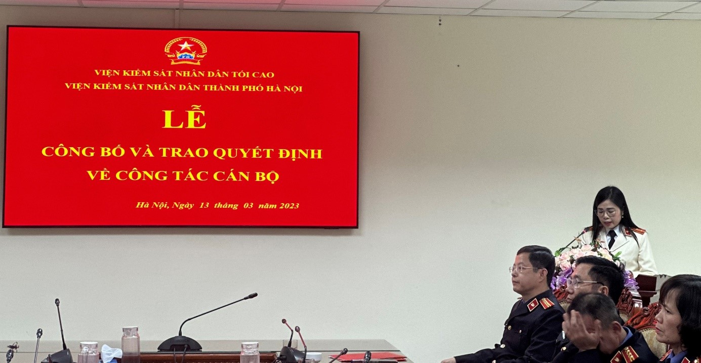 Ngày 13/3/2023, Viện KSND thành phố Hà Nội đã tổ chức Lễ công bố và trao quyết định về công tác cán bộ. Chủ trì buổi Lễ có đồng chí Ngô Hồng Sơn – Ủy viên Ban Cán sự đảng, Phó Bí thư Đảng ủy, Phó Viện trưởng Viện KSND Thành phố và đồng chí Bùi Thị Hồng Anh, Ủy viên Ban Cán sự đảng, Phó Viện trưởng Viện KSND Thành phố tham dự.