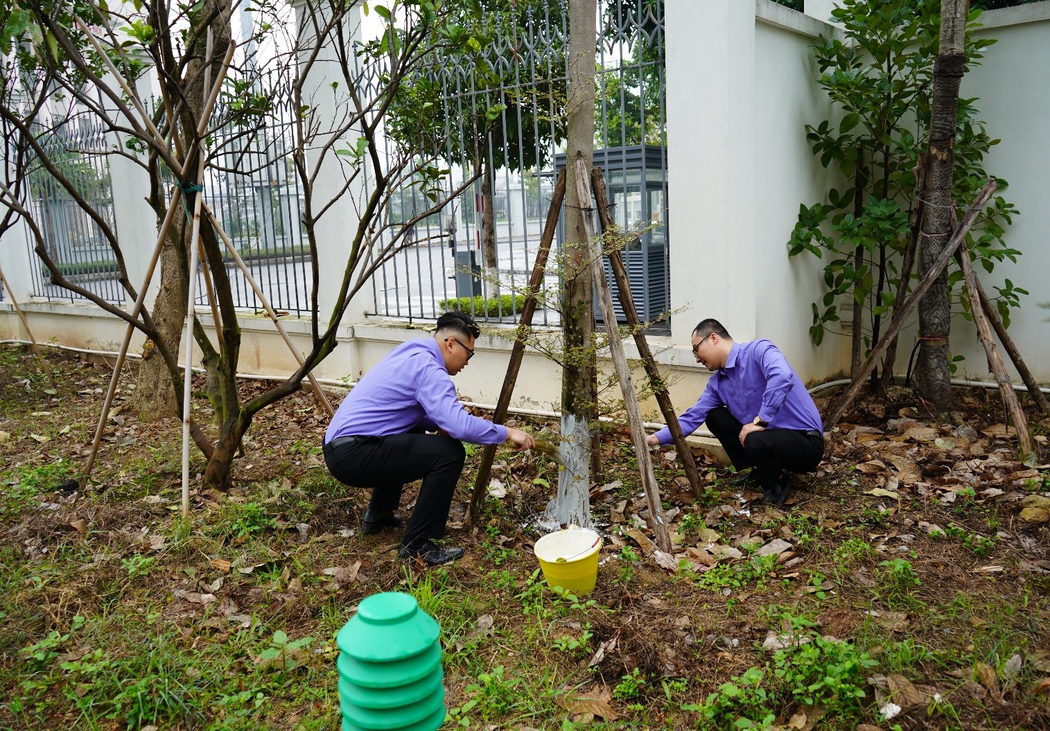 Các đoàn viên thanh niên quét vôi, nhổ cỏ tại các gốc cây xanh trong khuôn viên cơ quan