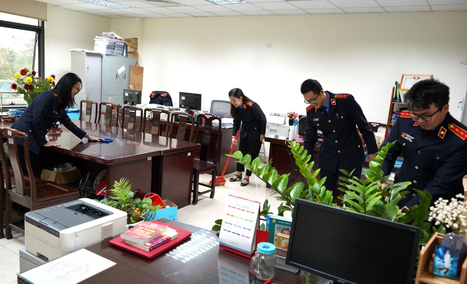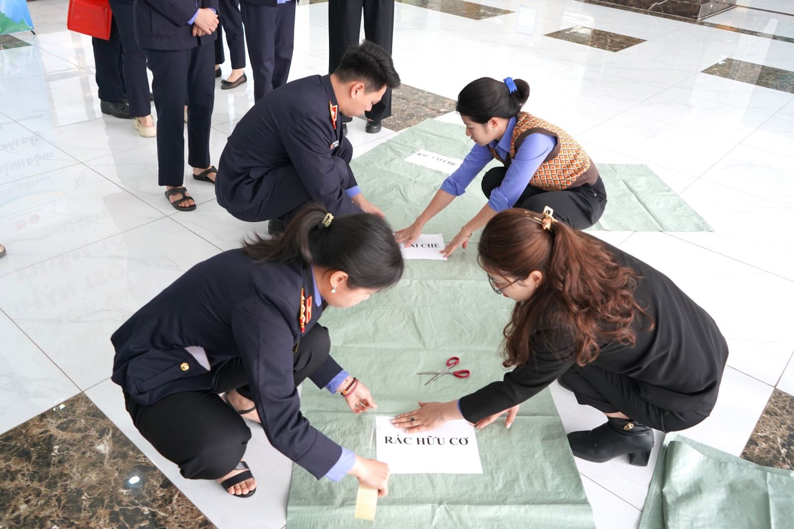 Các đồng chí đoàn viên thanh niên tích cực dọn dẹp, phân loại rác tại phòng làm việc