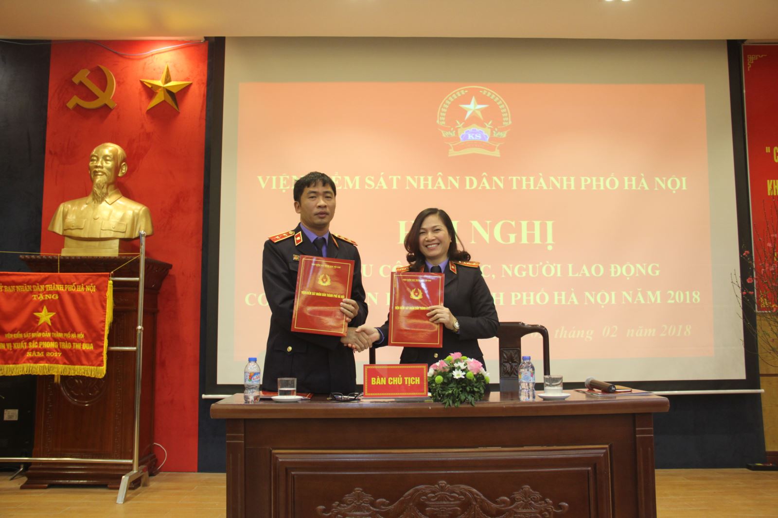 Sáng ngày 02/02/2018, Viện KSND thành phố Hà Nội đã phối hợp cùng Công đoàn cơ quan tổ chức Hội nghị đại biểu công chức, người lao động năm 2018, với sự tham gia của tập thể công chức, người lao động của 15 phòng nghiệp vụ. Hội nghị đã bầu ra Đoàn Chủ tịch gồm 02 đồng chí là đồng chí Nguyễn Duy Giảng - Viện trưởng Viện KSND thành phố và đồng chí Bùi Thị Hồng Anh - Chủ tịch Công đoàn, Phó Viện trưởng Viện KSND thành phố.