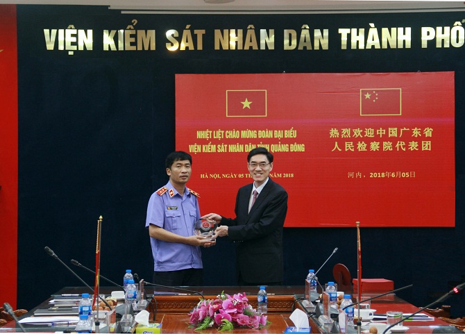 Trong khuôn khổ chuyến thăm và làm việc tại Việt Nam, ngày 05/6/2018, Đoàn đại biểu Viện KSND tỉnh Quảng Đông, Trung Quốc do đồng chí Diệp Thiếu Minh - Phó Viện trưởng làm Trưởng đoàn đã có buổi thăm và làm việc với Viện KSND thành phố Hà Nội. Tiếp đoàn có đồng chí Nguyễn Duy Giảng - Viện trưởng Viện KSND thành phố, đồng chí Đào Văn Cường - Phó Viện trưởng Viện KSND thành phố cùng các đồng chí Lãnh đạo Văn phòng tổng hợp, Phòng tổ chức cán bộ, Phòng Kế hoạch tài chính, Phòng 2 Viện KSND thành phố.