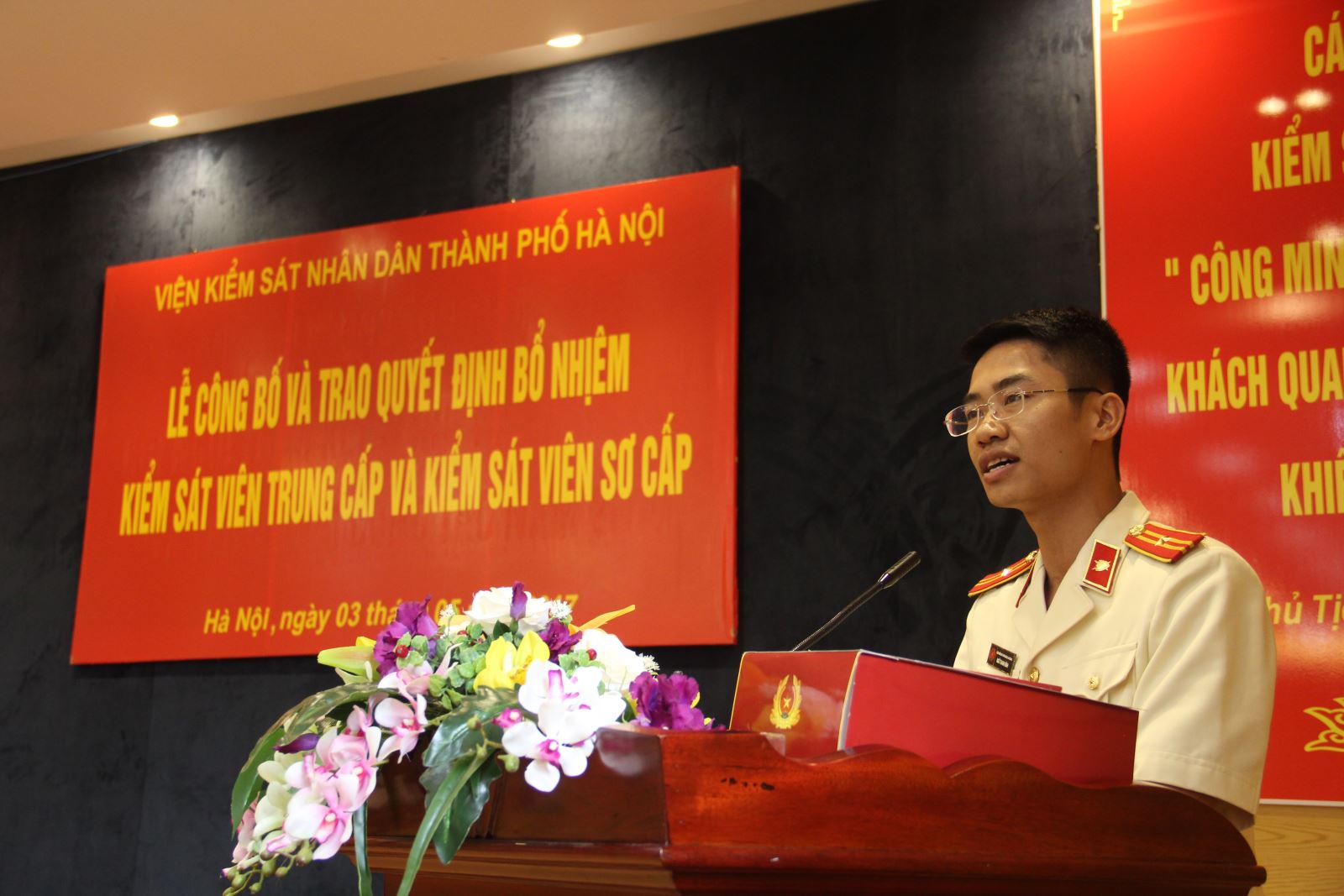 Đồng chí Ngô Thanh Bình Kiểm sát viên sơ cấp đã thay mặt các đồng chí được bổ nhiệm Kiểm sát viên cảm ơn sự quan tâm của Ban cán sự Đảng, Lãnh đạo Viện kiểm sát nhân dân thành phố, hứa trên cương vị mới sẽ luôn học hỏi, nâng cao nghiệp vụ công tác, bản lĩnh của người Kiểm sát viên và góp phần xây dựng cơ quan, đơn vị ngày càng vững mạnh.