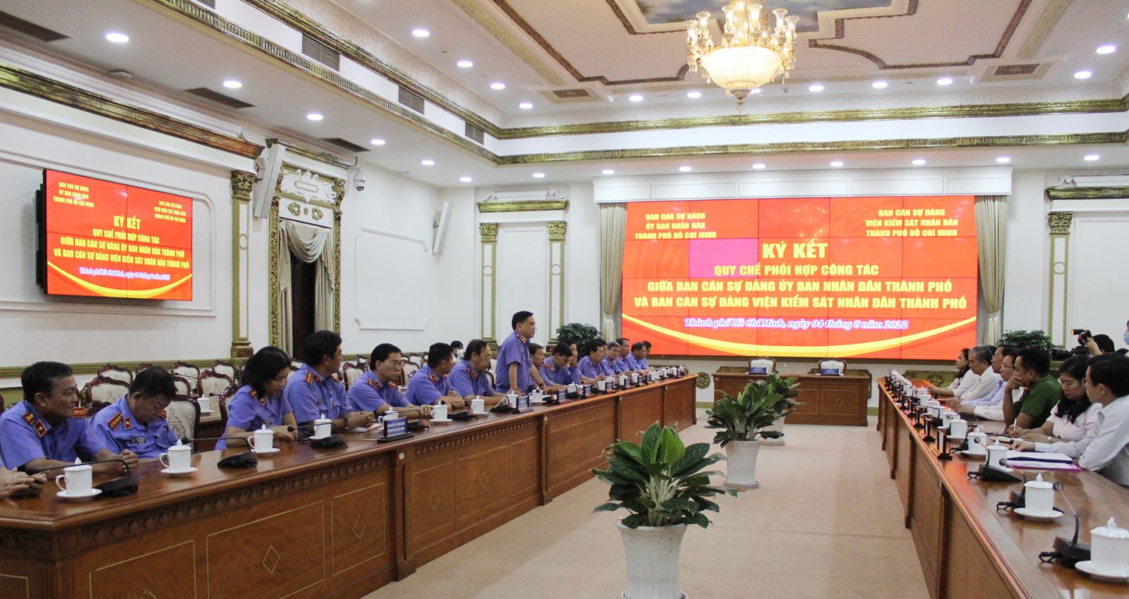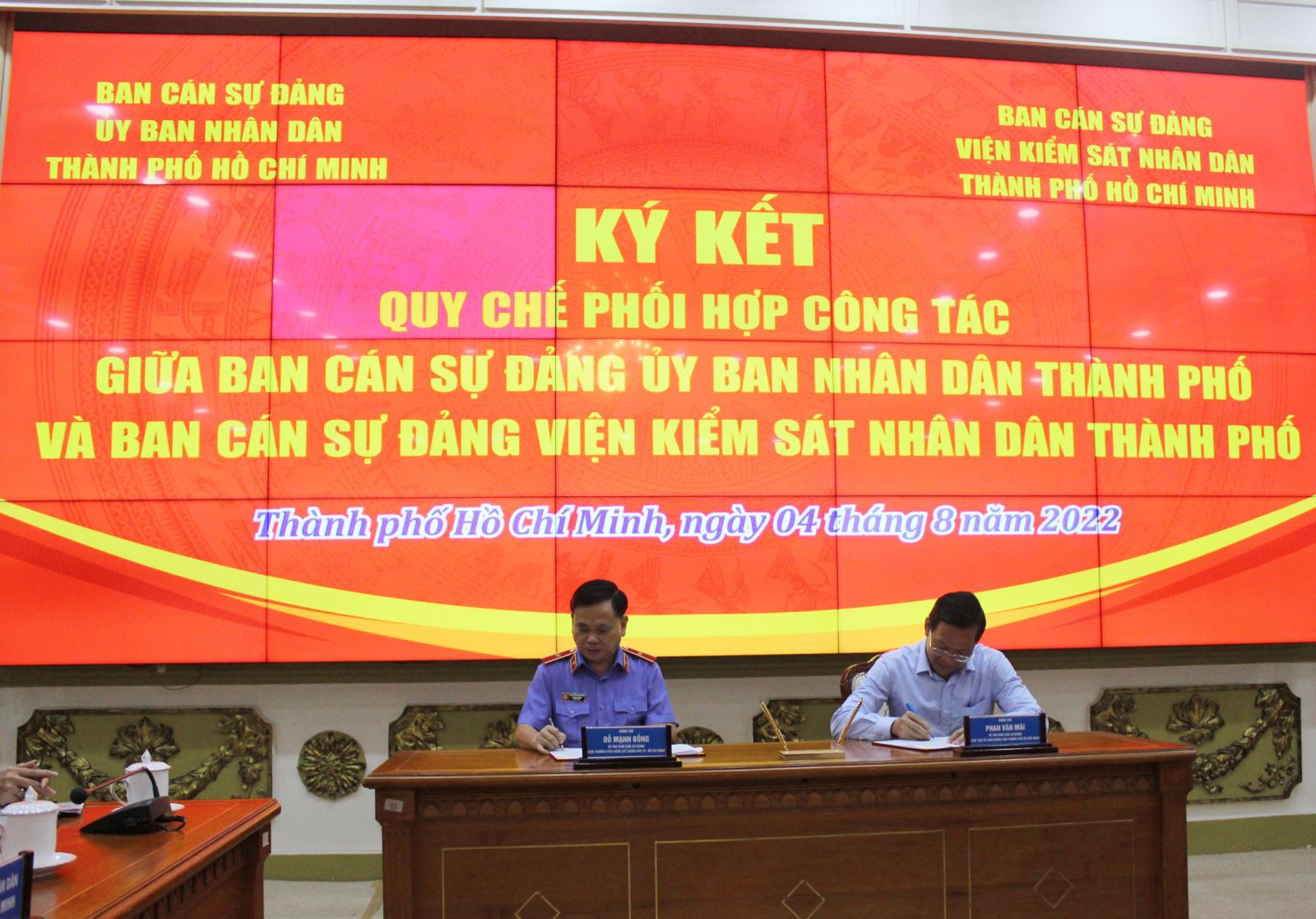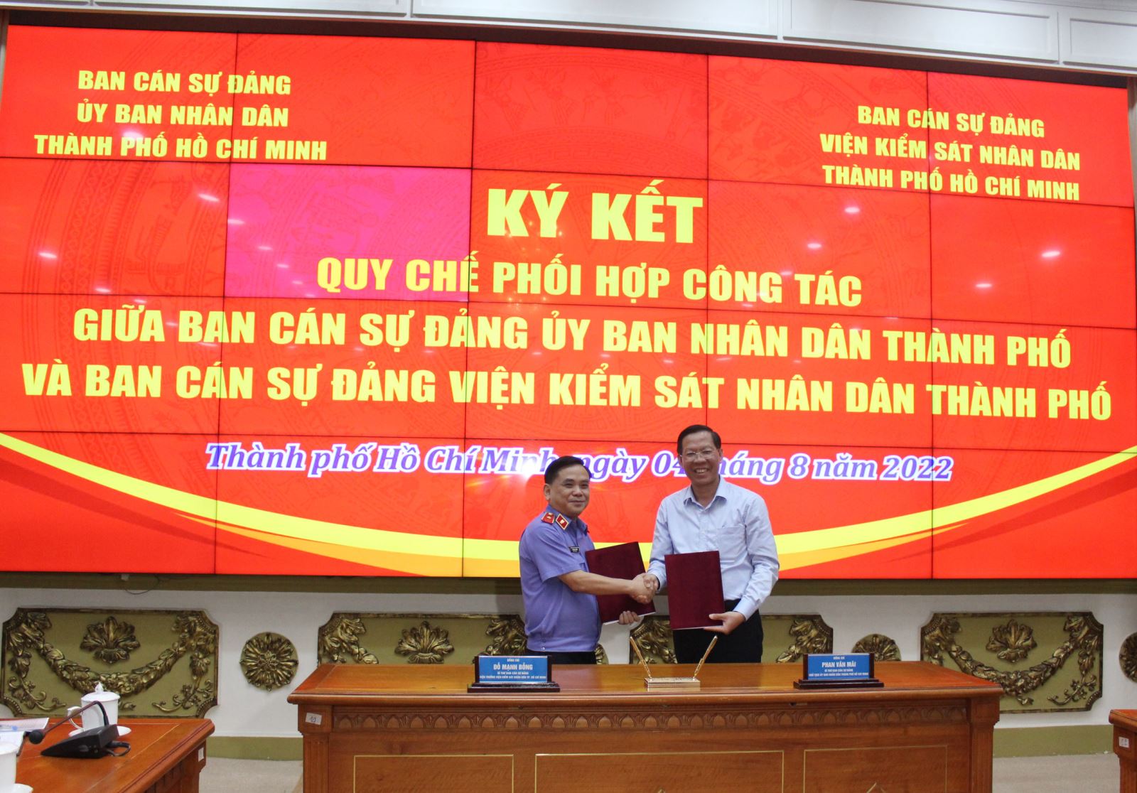 Căn cứ Điều lệ Đảng Cộng sản Việt Nam; căn cứ Quy chế làm việc của Ban Chấp hành Đảng bộ, Ban Thường vụ Thành ủy và Thường trực Thành ủy Thành phố Hồ Chí Minh; căn cứ Quy chế làm việc của Ban Cán sự đảng UBND Thành phố Hồ Chí Minh, Ban Cán sự đảng Viện KSND Thành phố Hồ Chí Minh; sáng ngày 04/08/2022 tại trụ sở UBND Thành phố Hồ Chí Minh đã tổ chức lễ ký kết “Quy chế phối hợp công tác giữa Ban Cán sự đảng UBND Thành phố Hồ Chí Minh với Ban Cán sự đảng Viện KSND Thành phố Hồ Chí Minh”.