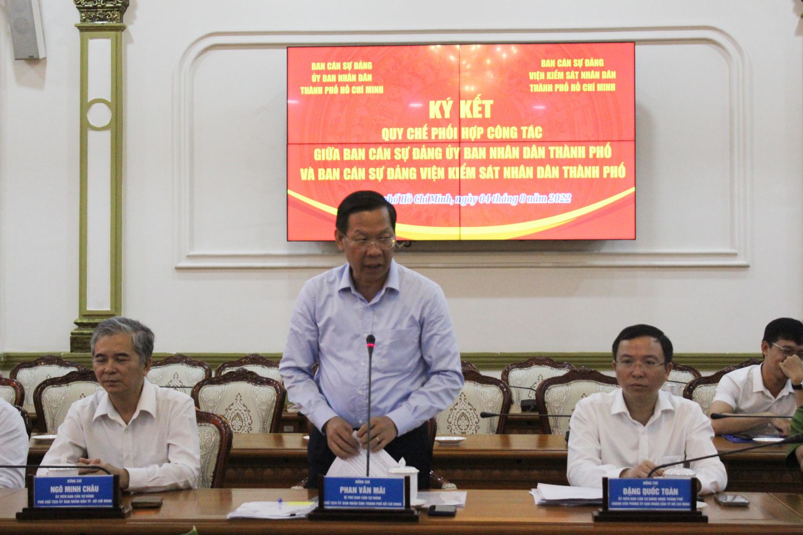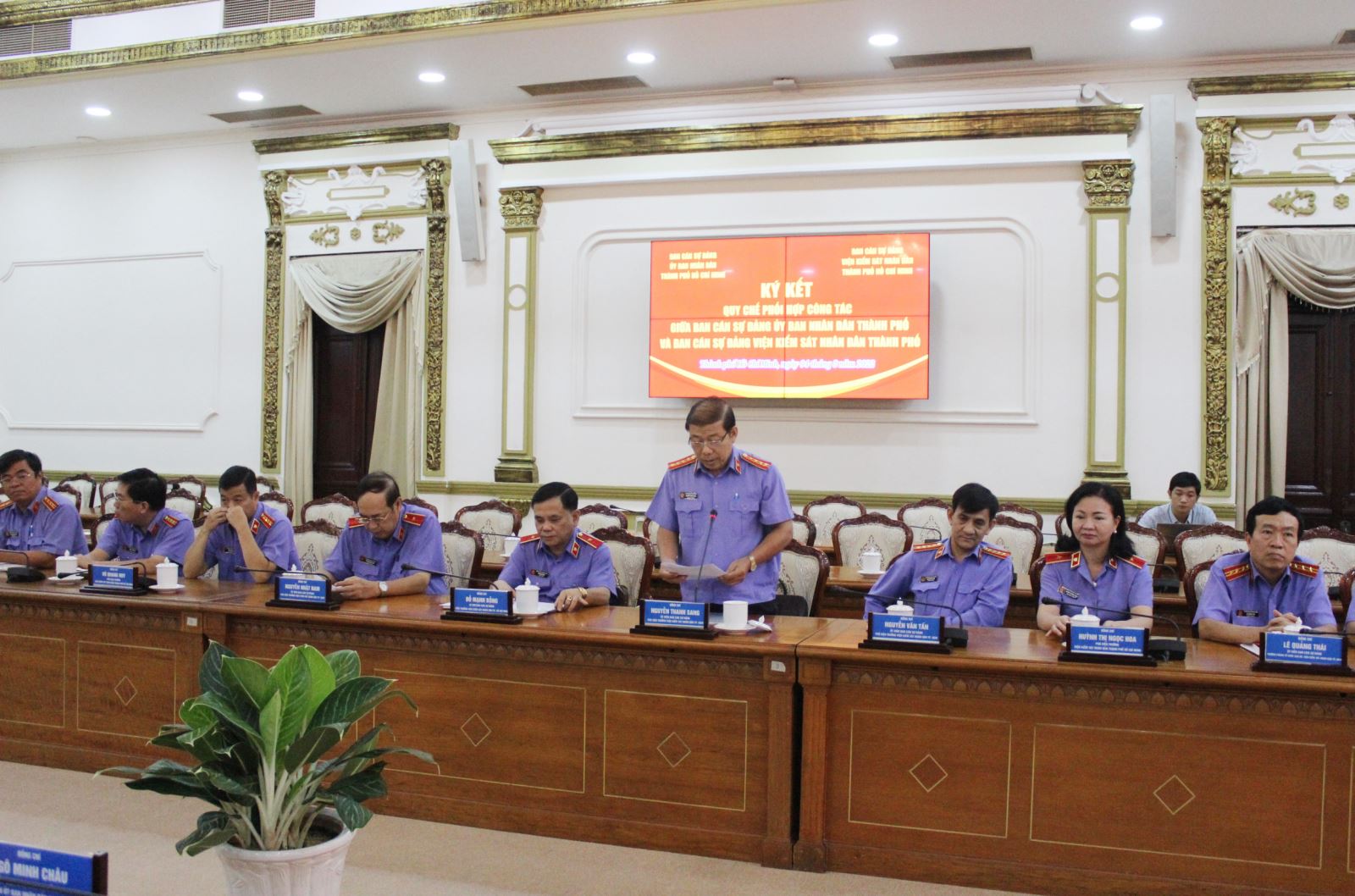 Tham dự và chủ trì lễ ký kết có đồng chí Phan Văn Mãi - Bí thư Ban cán sự đảng, Chủ tịch UBND Thành phố Hồ Chí Minh và đồng chí Đỗ Mạnh Bổng - Bí thư Ban cán sự đảng, Viện trưởng Viện KSND Thành phố Hồ Chí Minh (đồng chủ trì); các đồng chí Thành viên Ban cán sự đảng UBND Thành phố; các đồng chí Thành viên Ban cán sự đảng Viện KSND Thành phố; đại diện lãnh đạo các đơn vị: Ban Nội chính - Thành uỷ, Toà án nhân dân Thành phố, Công an Thành phố, Sở tư pháp; các đồng chí Phó Chánh Văn phòng UBND Thành phố; Trưởng các phòng nghiệp vụ Viện KSND thành phố...