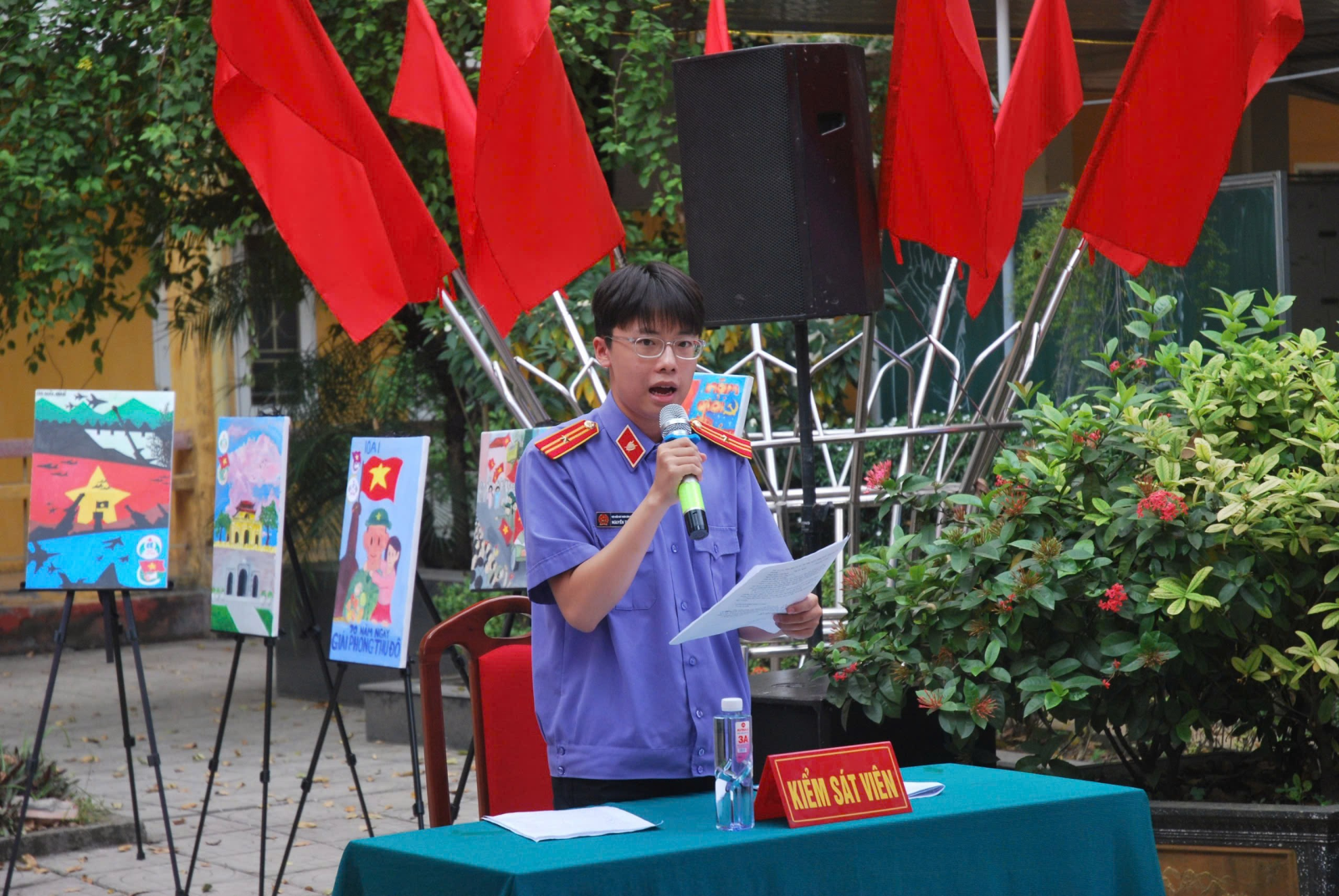 Bạn học sinh trong vai Kiểm sát viên công bố bản Cáo trạng
